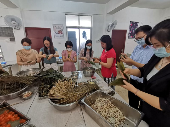 活動(dòng)現(xiàn)場(chǎng)準(zhǔn)備了糯米、粽葉、板栗、蛋黃等材料,大家圍在一起,從嘗試、普及到大展身手,歡聲笑語(yǔ)、棕葉飄香,參與人員包得不亦樂(lè)乎。