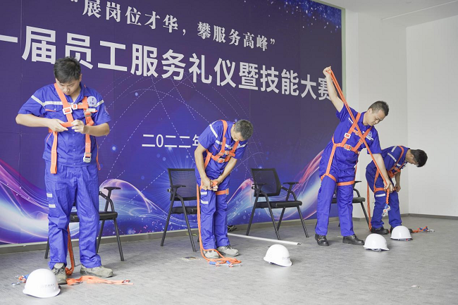 安全繩及安全帽規(guī)范穿脫是工程人員在高空作業(yè)前必備的一項技能,7名選手的精彩展示,贏得了現(xiàn)場觀眾和評委的陣陣掌聲。