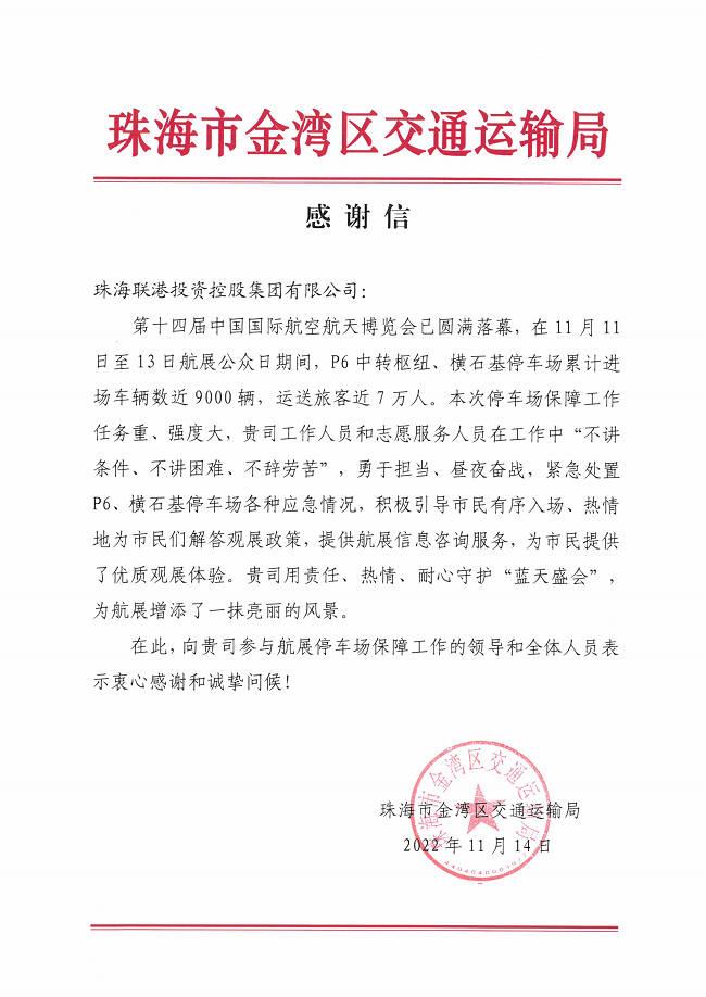 珠海市金灣區(qū)交通運(yùn)輸局向聯(lián)港集團(tuán)參與航展停車(chē)場(chǎng)保障工作的領(lǐng)導(dǎo)和全體人員表示衷心感謝和誠(chéng)摯問(wèn)候!